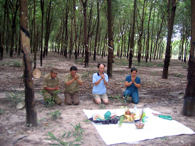 10 giờ 30 phút, lúc này giờ cạo mủ cao-su cũng vừa tan, người dân địa phương kéo ra mỗi lúc một đông. Người chia sẻ, kẻ hỏi thăm, ai ai cũng tỏ lòng thành kính với các liệt sĩ, mong cho chúng tôi sớm tìm được mộ bố. Trong đám đông, ngoài Tí Út đã cùng với chúng tôi từ sáng sớm có thêm bốn người khác cùng là cháu trai, cháu dâu của bà Ba Cô, sau này chúng tôi mới biết tên là Tùng, Út Phượng, Út mười Hai và Quân đã chủ động ở lại giúp đỡ chúng tôi trong việc tìm kiếm. Đợi chúng tôi thắp hương xong, mấy thanh niên đứng bên cũng tự lấy hương cắm lên mấy mô đất và rộng ra xung quanh. Tôi nghe rõ giọng nói nhỏ nhẹ của Út Phượng khấn: "Chúng tôi là người dân sống ở quanh đây, cầu mong mấy ổng ở đâu mau mau ứng báo, hiện lên cho con cháu và người thân sớm được tìm thấy để đưa các ổng về với quê hương và tổ tiên đất Bắc". Nhân lúc hương còn đang cháy, tôi gọi điện hỏi thăm nhà ngoại cảm Nguyễn Khắc Bảy về vị trí định đào và khả năng linh ứng. Ông Nguyễn Khắc Bảy nói ngay: "Các anh vừa thắp hương xong hả ? chỗ ấy đang khá đông người ? Tất cả ai có mặt đều đứng nguyên chắp tay khấn vái xin các liệt sĩ đi ! Lát nữa, khoảng 15-20 phút sẽ có con thằn lằn xuất hiện, nằm ở đâu thì đào ở đó". Khi nói chuyện với Nguyễn Khắc Bảy, tôi có kinh nghiệm hỏi thật to và nghe được gì cũng nhắc lại thật rõ để mọi người cùng nghe và nhớ hộ. Chỉ khoảng 10 phút sau khi gọi điện, mọi người vẫn còn đứng nguyên, quả nhiên có một con thằn lằn màu nâu đất chỉ to bằng đầu chiếc đũa, trườn từ trong đống lá khô, qua chân tôi lên đúng nơi có ba nén hương đang cháy dở và nằm ở đó. Tôi không bỏ lỡ cơ hội chụp mấy kiểu ảnh và quay vi-de-o để làm kỷ niệm. Điều linh ứng kỳ lạ này đã khiến cho ông Hải Đường, ông Tám, ông Năm vốn không tin nhiều vào chuyện tâm linh cũng phải ngỡ ngàng, tin tưởng. Sự xuất hiện đúng lúc của con thằn lằn càng khiến mọi người có thêm niềm tin và động lực.