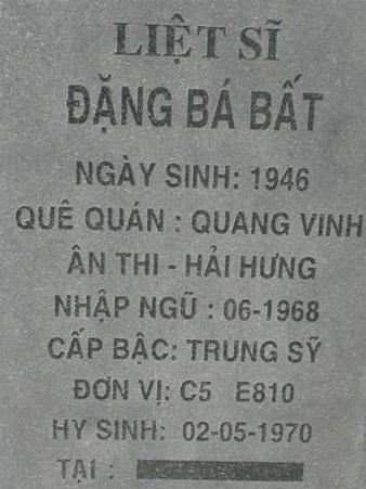 Liệt sĩ nhập ngũ: 06/1968. Nguyên quán trên bia mộ: Quang Vinh, Ân Thi, Hải Hưng. Thông tin chi tiết xin liên hệ bác Nguyễn Sỹ Hồ hoặc ban quản trang NTLS tỉnh Bình Phước. Địa chỉ: QL14 - xã Đồng Tiến, huyện Đồng Phú, tỉnh Bình Phước, điện thoại: 0651.3885210.