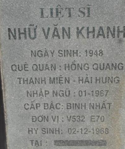 Liệt sĩ nhập ngũ: 01/1967. Nguyên quán trên bia: Hồng Quang,Thanh Miện, Hải Hưng. Thông tin chi tiết xin liên hệ bác Nguyễn Sỹ Hồ hoặc ban quản trang NTLS tỉnh Bình Phước. Địa chỉ: QL14 - xã Đồng Tiến, huyện Đồng Phú, tỉnh Bình Phước, điện thoại: 0651.3885210.