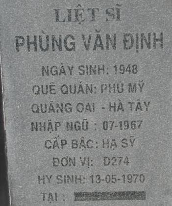 Liệt sĩ nhâp ngũ: 07/1967. Nguyên quán trên bia: Phú Mỹ, Quảng Oai, Hà Tây. Thông tin chi tiết xin liên hệ bác Nguyễn Sỹ Hồ hoặc ban quản trang NTLS tỉnh Bình Phước. Địa chỉ: QL14 - xã Đồng Tiến, huyện Đồng Phú, tỉnh Bình Phước, điện thoại: 0651.3885210.