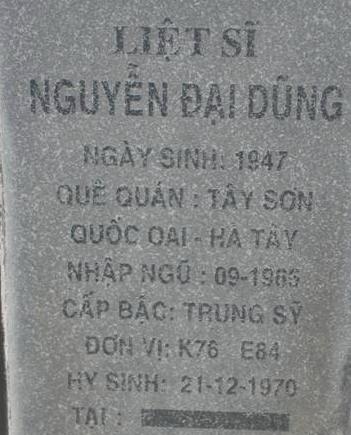 Liệt sĩ nhâp ngũ: 09/1966. Nguyên quán trên bia: Tây Sơn, Quốc Oai, Hà Tây. Thông tin chi tiết xin liên hệ bác Nguyễn Sỹ Hồ hoặc ban quản trang NTLS tỉnh Bình Phước. Địa chỉ: QL14 - xã Đồng Tiến, huyện Đồng Phú, tỉnh Bình Phước, điện thoại: 0651.3885210.