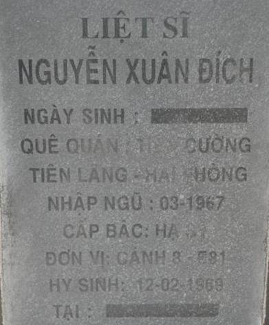 Liệt sĩ nhập ngũ: 03/1967. Nguyên quán trên bia: --Cường, Tiên Lãng, Hải Phòng. Thông tin chi tiết xin liên hệ bác Nguyễn Sỹ Hồ hoặc ban quản trang NTLS tỉnh Bình Phước. Địa chỉ: QL14 - xã Đồng Tiến, huyện Đồng Phú, tỉnh Bình Phước, điện thoại: 0651.3885210.