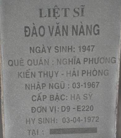 Liệt sĩ nhập ngũ: 03/1967. Nguyên quán trên bia: Nghĩa Phương, Kiến Thụy,Hải Phòng. Thông tin chi tiết xin liên hệ bác Nguyễn Sỹ Hồ hoặc ban quản trang NTLS tỉnh Bình Phước. Địa chỉ: QL14 - xã Đồng Tiến, huyện Đồng Phú, tỉnh Bình Phước, điện thoại: 0651.3885210.