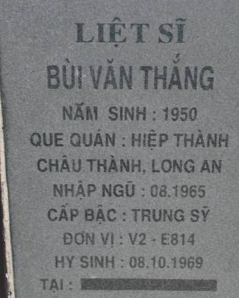 Liệt sĩ nhập ngũ: 08/1965. Nguyên quán trên bia: Hiệp Thành, Châu Thành, Long An. Thông tin chi tiết xin liên hệ bác Nguyễn Sỹ Hồ hoặc ban quản trang NTLS tỉnh Bình Phước. Địa chỉ: QL14 - xã Đồng Tiến, huyện Đồng Phú, tỉnh Bình Phước, điện thoại: 0651.3885210.