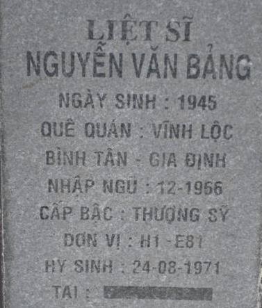Liệt sĩ nhập ngũ: 12/1966. Nguyên quán trên bia: Vĩnh Lộc, Bình Tân, Gia Định. Thông tin chi tiết xin liên hệ bác Nguyễn Sỹ Hồ hoặc ban quản trang NTLS tỉnh Bình Phước. Địa chỉ: QL14 - xã Đồng Tiến, huyện Đồng Phú, tỉnh Bình Phước, điện thoại: 0651.3885210.