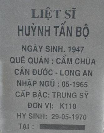 Liệt sĩ nhập ngũ: 05/1965. Nguyên quán trên bia: Cẩm Hòa, Cần Đước, Long An. Thông tin chi tiết xin liên hệ bác Nguyễn Sỹ Hồ hoặc ban quản trang NTLS tỉnh Bình Phước. Địa chỉ: QL14 - xã Đồng Tiến, huyện Đồng Phú, tỉnh Bình Phước, điện thoại: 0651.3885210