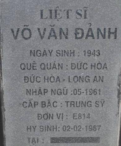Liệt sĩ nhập ngũ: 05/1961. Nguyên quán trên bia: Đức Hòa, Đức Hòa, Long An. Thông tin chi tiết xin liên hệ bác Nguyễn Sỹ Hồ hoặc ban quản trang NTLS tỉnh Bình Phước. Địa chỉ: QL14 - xã Đồng Tiến, huyện Đồng Phú, tỉnh Bình Phước, điện thoại: 0651.3885210