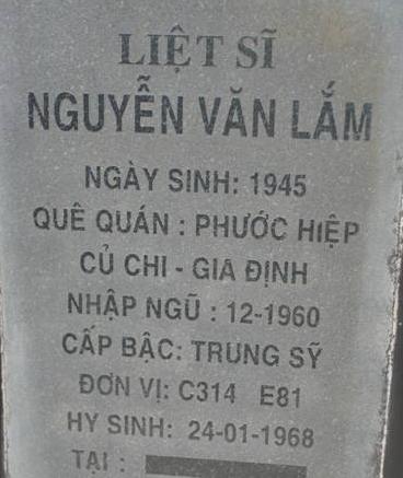 Ls nhập ngũ: 12/1960. Nguyên quán trên bia: Phước Hiệp, Củ Chi, Gia Định. Thông tin chi tiết xin liên hệ bác Nguyễn Sỹ Hồ hoặc ban quản trang NTLS tỉnh Bình Phước. Địa chỉ: QL14 - xã Đồng Tiến, huyện Đồng Phú, tỉnh Bình Phước, điện thoại: 0651.3885210.