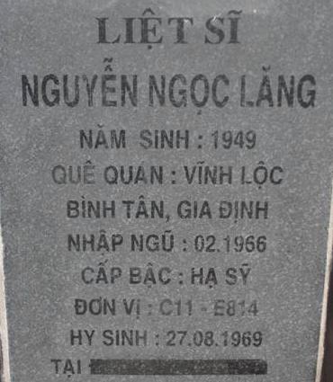 Ls nhập ngũ: 02/1966. Nguyên quán trên bia: Xuân Lộc, Bình Tân, Gia Định. Thông tin chi tiết xin liên hệ bác Nguyễn Sỹ Hồ hoặc ban quản trang NTLS tỉnh Bình Phước. Địa chỉ: QL14 - xã Đồng Tiến, huyện Đồng Phú, tỉnh Bình Phước, điện thoại: 0651.3885210.