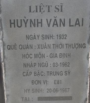 Ls nhập ngũ: 03/1962. Nguyên quán trên bia: Xuân Thới Thượng, Hóc Môn, Gia Định. Thông tin chi tiết xin liên hệ bác Nguyễn Sỹ Hồ hoặc ban quản trang NTLS tỉnh Bình Phước. Địa chỉ: QL14 - xã Đồng Tiến, huyện Đồng Phú, tỉnh Bình Phước, điện thoại: 0651.3885210.