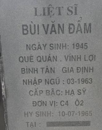 Liệt sĩ nhập ngũ: 03/1963. Nguyên quán trên bia: Vĩnh Lợi, Bình Tân, Gia Định. Thông tin chi tiết xin liên hệ bác Nguyễn Sỹ Hồ hoặc ban quản trang NTLS tỉnh Bình Phước. Địa chỉ: QL14 - xã Đồng Tiến, huyện Đồng Phú, tỉnh Bình Phước, điện thoại: 0651.3885210.