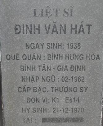 Liệt sĩ nhập ngũ: 02/1962. Nguyên quán trên bia: Bình Hưng Hòa, Bình Tân, Gia Định. Thông tin chi tiết xin liên hệ bác Nguyễn Sỹ Hồ hoặc ban quản trang NTLS tỉnh Bình Phước. Địa chỉ: QL14 - xã Đồng Tiến, huyện Đồng Phú, tỉnh Bình Phước, điện thoại: 0651.3885210.