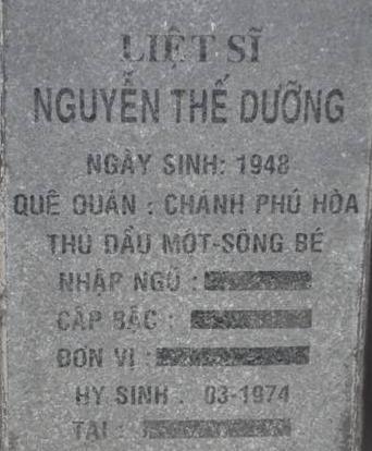 Nguyên quán trên bia: Chánh Phú Hòa, Thủ Dầu Một, Sông Bé. Thông tin chi tiết xin liên hệ bác Nguyễn Sỹ Hồ hoặc ban quản trang NTLS tỉnh Bình Phước. Địa chỉ: QL14 - xã Đồng Tiến, huyện Đồng Phú, tỉnh Bình Phước, điện thoại: 0651.3885210.