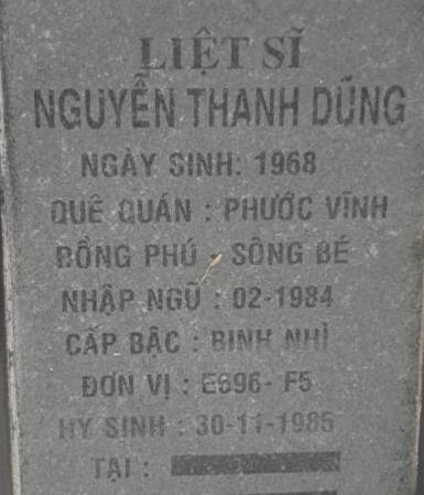 Ls nhập ngũ: 02/1984. Nguyên quán trên bia: Phước Vĩnh, Đồng Phú, Sông Bé. Thông tin chi tiết xin liên hệ bác Nguyễn Sỹ Hồ hoặc ban quản trang NTLS tỉnh Bình Phước. Địa chỉ: QL14 - xã Đồng Tiến, huyện Đồng Phú, tỉnh Bình Phước, điện thoại: 0651.3885210.