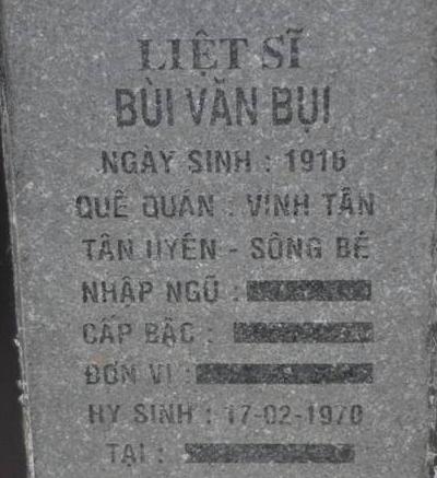 Nguyên quán trên bia: Vĩnh Tân, Tân Uyên, Sông Bé. Thông tin chi tiết xin liên hệ bác Nguyễn Sỹ Hồ hoặc ban quản trang NTLS tỉnh Bình Phước. Địa chỉ: QL14 - xã Đồng Tiến, huyện Đồng Phú, tỉnh Bình Phước, điện thoại: 0651.3885210.