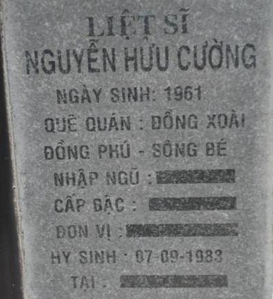 Nguyên quán trên bia: Đồng Xoài, Đồng Phú, Sông Bé. Thông tin chi tiết xin liên hệ bác Nguyễn Sỹ Hồ hoặc ban quản trang NTLS tỉnh Bình Phước. Địa chỉ: QL14 - xã Đồng Tiến, huyện Đồng Phú, tỉnh Bình Phước, điện thoại: 0651.3885210.