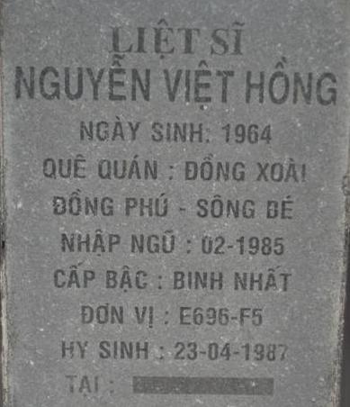 Ls nhập ngũ: 02/1985. Nguyên quán trên bia: Đồng Xoài, Đồng Phú, Sông Bé. Thông tin chi tiết xin liên hệ bác Nguyễn Sỹ Hồ hoặc ban quản trang NTLS tỉnh Bình Phước. Địa chỉ: QL14 - xã Đồng Tiến, huyện Đồng Phú, tỉnh Bình Phước, điện thoại: 0651.3885210.