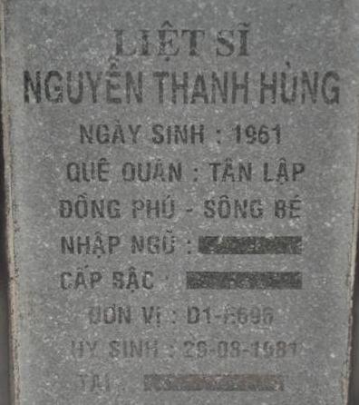 Nguyên quán trên bia: Tân Lập, Đồng Phú, Sông Bé. Thông tin chi tiết xin liên hệ bác Nguyễn Sỹ Hồ hoặc ban quản trang NTLS tỉnh Bình Phước. Địa chỉ: QL14 - xã Đồng Tiến, huyện Đồng Phú, tỉnh Bình Phước, điện thoại: 0651.3885210.