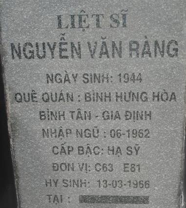 Ls nhập ngũ: 06/1962. Nguyên quán trên bia: Bình Hưng Hòa, Bình Tân, Gia Định. Thông tin chi tiết xin liên hệ bác Nguyễn Sỹ Hồ hoặc ban quản trang NTLS tỉnh Bình Phước. Địa chỉ: QL14 - xã Đồng Tiến, huyện Đồng Phú, tỉnh Bình Phước, điện thoại: 0651.3885210.