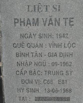 Ls nhập ngũ: 09/1962. Nguyên quán trên bia: Vĩnh Lộc, Bình Tân, Gia Định. Thông tin chi tiết xin liên hệ bác Nguyễn Sỹ Hồ hoặc ban quản trang NTLS tỉnh Bình Phước. Địa chỉ: QL14 - xã Đồng Tiến, huyện Đồng Phú, tỉnh Bình Phước, điện thoại: 0651.3885210.