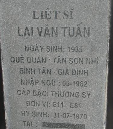 Ls nhập ngũ: 05/1962. Nguyên quán trên bia: Tân Sơn Nhì, Bình Tân, Gia Định. Thông tin chi tiết xin liên hệ bác Nguyễn Sỹ Hồ hoặc ban quản trang NTLS tỉnh Bình Phước. Địa chỉ: QL14 - xã Đồng Tiến, huyện Đồng Phú, tỉnh Bình Phước, điện thoại: 0651.3885210.