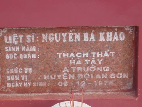 Nguyên quán trên bia mộ: Thạch Thất, Hà Tây. Để tìm hiểu thêm thông tin mộ liệt sĩ , vui lòng liên hệ: