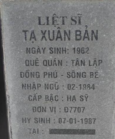 Ls nhập ngũ: 02/1984. Nguyên quán trên bia: Tân Lập, Đồng Phú, Sông Bé. Thông tin chi tiết xin liên hệ bác Nguyễn Sỹ Hồ hoặc ban quản trang NTLS tỉnh Bình Phước. Địa chỉ: QL14 - xã Đồng Tiến, huyện Đồng Phú, tỉnh Bình Phước, điện thoại: 0651.3885210.