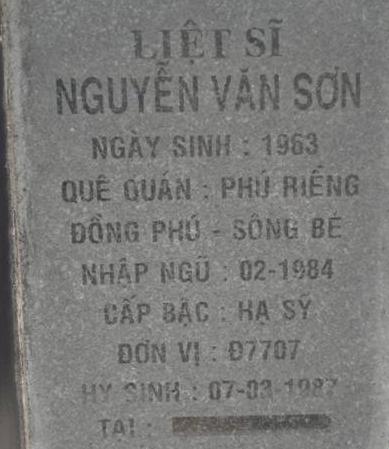 Ls nhập ngũ: 02/1984. Nguyên quán trên bia: Phú Riềng, Đồng Phú, Sông Bé. Thông tin chi tiết xin liên hệ bác Nguyễn Sỹ Hồ hoặc ban quản trang NTLS tỉnh Bình Phước. Địa chỉ: QL14 - xã Đồng Tiến, huyện Đồng Phú, tỉnh Bình Phước, điện thoại: 0651.3885210.