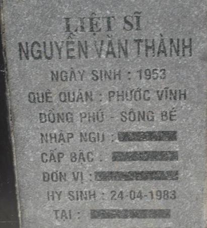 Nguyên quán trên bia: Phước Vĩnh, Đồng Phú, Sông Bé. Thông tin chi tiết xin liên hệ bác Nguyễn Sỹ Hồ hoặc ban quản trang NTLS tỉnh Bình Phước. Địa chỉ: QL14 - xã Đồng Tiến, huyện Đồng Phú, tỉnh Bình Phước, điện thoại: 0651.3885210.