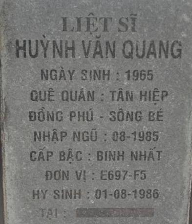 Ls nhập ngũ: 08/1985. Nguyên quán trên bia: Tân Hiệp, Đồng Phú, Sông Bé. Thông tin chi tiết xin liên hệ bác Nguyễn Sỹ Hồ hoặc ban quản trang NTLS tỉnh Bình Phước. Địa chỉ: QL14 - xã Đồng Tiến, huyện Đồng Phú, tỉnh Bình Phước, điện thoại: 0651.3885210.