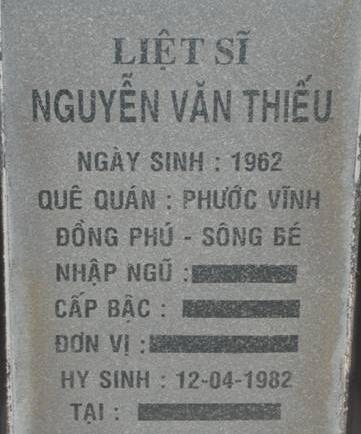 Nguyên quán trên bia: Phước Vĩnh, Đồng Phú, Sông Bé. Thông tin chi tiết xin liên hệ bác Nguyễn Sỹ Hồ hoặc ban quản trang NTLS tỉnh Bình Phước. Địa chỉ: QL14 - xã Đồng Tiến, huyện Đồng Phú, tỉnh Bình Phước, điện thoại: 0651.3885210.