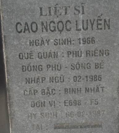 Ls nhập ngũ: 02/1986. Nguyên quán trên bia: Phú Riềng, Đồng Phú, Sông Bé. Thông tin chi tiết xin liên hệ bác Nguyễn Sỹ Hồ hoặc ban quản trang NTLS tỉnh Bình Phước. Địa chỉ: QL14 - xã Đồng Tiến, huyện Đồng Phú, tỉnh Bình Phước, điện thoại: 0651.3885210.