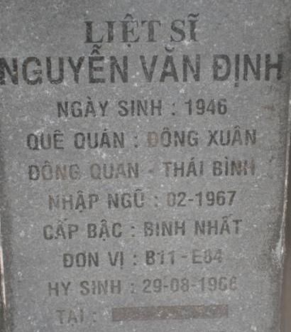 Ls nhập ngũ: 02/1967. Nguyên quán trên bia: Đông Xuân, Đông Quan,Thái Bình. Thông tin chi tiết xin liên hệ bác Nguyễn Sỹ Hồ hoặc ban quản trang NTLS tỉnh Bình Phước. Địa chỉ: QL14 - xã Đồng Tiến, huyện Đồng Phú, tỉnh Bình Phước, điện thoại: 0651.3885210.