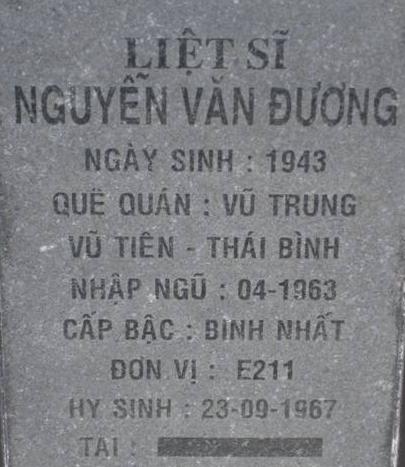 Ls nhập ngũ: 04/1963. Nguyên quán trên bia: Vũ Trung, Vũ Tiên,Thái Bình. Thông tin chi tiết xin liên hệ bác Nguyễn Sỹ Hồ hoặc ban quản trang NTLS tỉnh Bình Phước. Địa chỉ: QL14 - xã Đồng Tiến, huyện Đồng Phú, tỉnh Bình Phước, điện thoại: 0651.3885210.