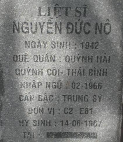 Ls nhập ngũ: 02/1966. Nguyên quán trên bia: Quỳnh Hải, Quỳnh Côi, Thái Bình. Thông tin chi tiết xin liên hệ bác Nguyễn Sỹ Hồ hoặc ban quản trang NTLS tỉnh Bình Phước. Địa chỉ: QL14 - xã Đồng Tiến, huyện Đồng Phú, tỉnh Bình Phước, điện thoại: 0651.3885210.