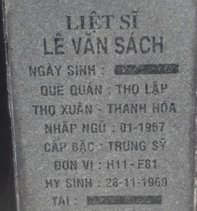 Ls nhập ngũ: 01/1967. Thông tin chi tiết xin liên hệ bác Nguyễn Sỹ Hồ hoặc ban quản trang NTLS tỉnh Bình Phước. Địa chỉ: QL14 - xã Đồng Tiến, huyện Đồng Phú, tỉnh Bình Phước, điện thoại: 0651.3885210.