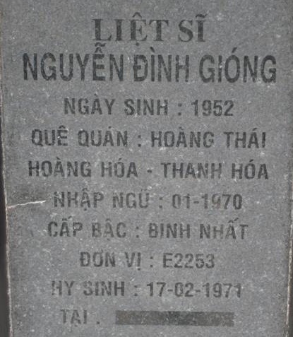 Ls nhập ngũ: 01/1970. Nguyên quán trên bia: Hoàng Thái, Hoằng Hóa, Thanh Hóa. Thông tin chi tiết xin liên hệ bác Nguyễn Sỹ Hồ hoặc ban quản trang NTLS tỉnh Bình Phước. Địa chỉ: QL14 - xã Đồng Tiến, huyện Đồng Phú, tỉnh Bình Phước, điện thoại: 0651.3885210.