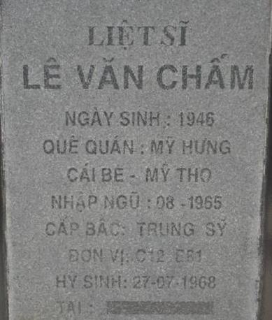 Ls nhập ngũ: 08/1965. Nguyên quán trên bia: Mỹ Hưng, Cái Bè, Mỹ Tho. Thông tin chi tiết xin liên hệ bác Nguyễn Sỹ Hồ hoặc ban quản trang NTLS tỉnh Bình Phước. Địa chỉ: QL14 - xã Đồng Tiến, huyện Đồng Phú, tỉnh Bình Phước, điện thoại: 0651.3885210.
