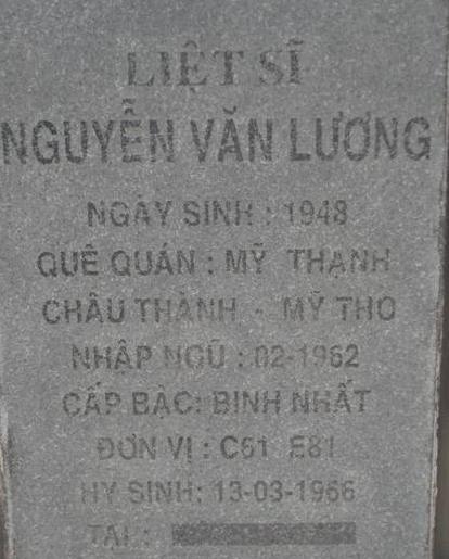 Ls nhập ngũ: 02/1962. Nguyên quán trên bia: Mỹ Thạnh, Châu Thành, Mỹ Tho. Thông tin chi tiết xin liên hệ bác Nguyễn Sỹ Hồ hoặc ban quản trang NTLS tỉnh Bình Phước. Địa chỉ: QL14 - xã Đồng Tiến, huyện Đồng Phú, tỉnh Bình Phước, điện thoại: 0651.3885210.