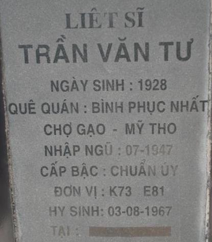 Ls nhập ngũ: 07/1947. Nguyên quán trên bia: Bình Phục Nhất, Chợ Gạo, Mỹ Tho. Thông tin chi tiết xin liên hệ bác Nguyễn Sỹ Hồ hoặc ban quản trang NTLS tỉnh Bình Phước. Địa chỉ: QL14 - xã Đồng Tiến, huyện Đồng Phú, tỉnh Bình Phước, điện thoại: 0651.3885210.