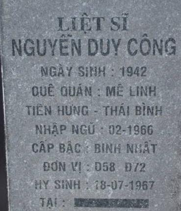 Ls nhập ngũ: 02/1966. Nguyên quán trên bia: Mê Linh, Tiên Hưng, Thái Bình. Thông tin chi tiết xin liên hệ bác Nguyễn Sỹ Hồ hoặc ban quản trang NTLS tỉnh Bình Phước. Địa chỉ: QL14 - xã Đồng Tiến, huyện Đồng Phú, tỉnh Bình Phước, điện thoại: 0651.3885210.