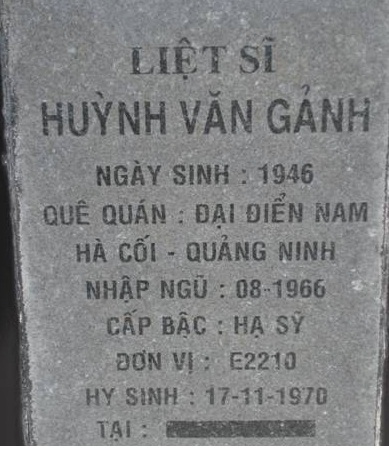 Ls nhập ngũ: 08/1966. Nguyên quán trên bia: Đại Điển Nam, Hà Cối, Quảng Ninh. Thông tin chi tiết xin liên hệ bác Nguyễn Sỹ Hồ hoặc ban quản trang NTLS tỉnh Bình Phước. Địa chỉ: QL14 - xã Đồng Tiến, huyện Đồng Phú, tỉnh Bình Phước, điện thoại: 0651.3885210.