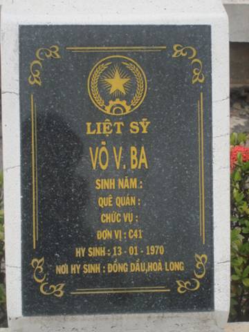 Tên liệt sỹ ghi trên bia: Võ V. Ba. Thông tin chi tiết xin liên hệ bác Nguyễn Sỹ Hồ hoặc ban quản trang NTLS tỉnh Bà Rịa - Vũng Tàu. Địa chỉ: Phường Phước Trung, thị xã Bà Rịa, tỉnh Bà Rịa - Vũng Tàu, điện thoại: 064.3827932.