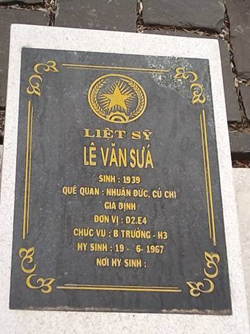 Quê quán ghi trên bia: Nhuận Đức-Củ Chi-Gia Định. Thông tin chi tiết xin liên hệ bác Nguyễn Sỹ Hồ hoặc ban quản trang NTLS tỉnh Bà Rịa - Vũng Tàu. Địa chỉ: Phường Phước Trung, thị xã Bà Rịa, tỉnh Bà Rịa - Vũng Tàu, điện thoại: 064.3827932.